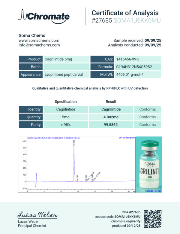 Cagrilintide incorporates amino acid substitutions that increase resistance to enzymatic degradation, allowing for improved pharmacokinetic properties compared to the native peptide. Researchers are particularly interested in its binding affinity across the amylin receptor complex, which is composed of the calcitonin receptor in combination with receptor activity-modifying proteins (RAMPs). Current studies focus on evaluating its pharmacology, receptor dynamics, and its potential applications in metabolic research.