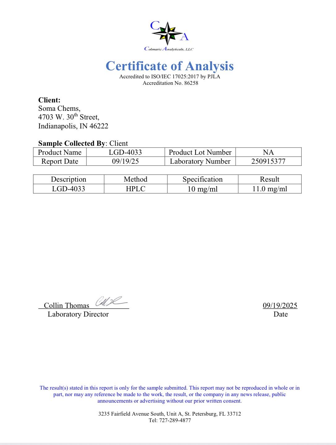 LGD-4033 is a non-steroidal SARM studied for its high binding affinity to androgen receptors and its potential to promote anabolic activity in muscle and bone tissues. Research focuses on dose-dependent receptor activation, lean mass modulation, and hormonal feedback mechanisms.