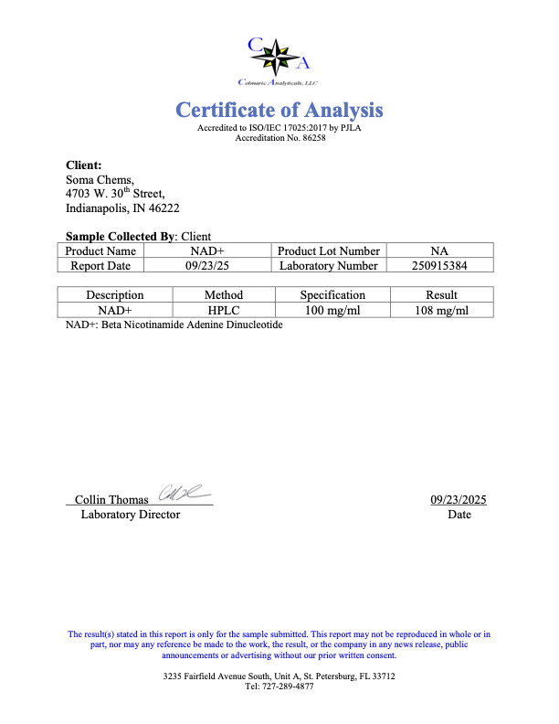 NAD+ is a crucial coenzyme found in all living cells, acting as an electron carrier in redox reactions and playing a key role in cellular metabolism. It exists in both oxidized (NAD⁺) and reduced (NADH) forms. Research has focused on NAD⁺ in relation to mitochondrial function, sirtuin activity, and DNA repair mechanisms. In laboratory settings, NAD⁺ is frequently utilized to study energy homeostasis, enzymatic reactions, and age-related cellular pathways.