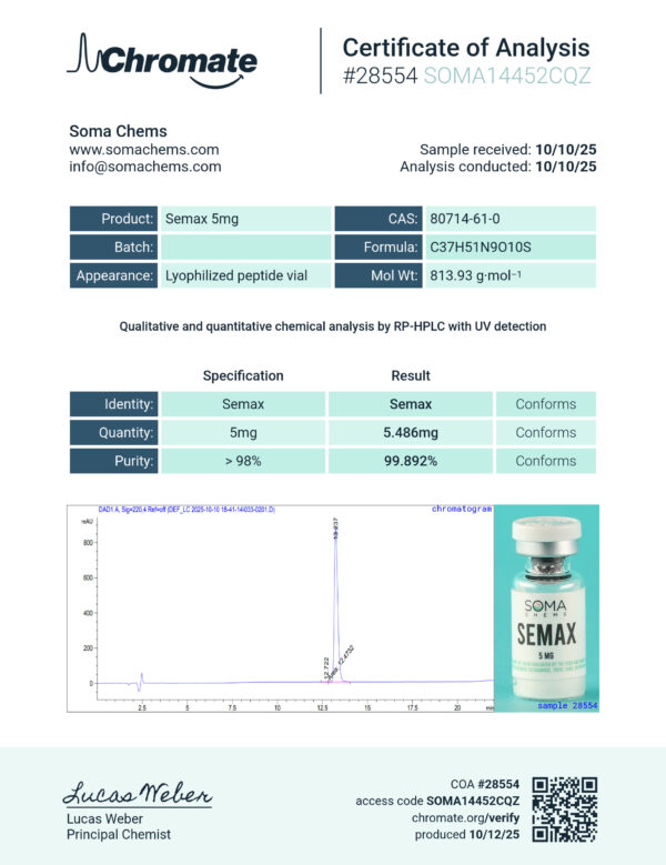 As a research peptide, Semax 5mg is supplied in lyophilized form, requiring proper reconstitution prior to use in laboratory experiments.