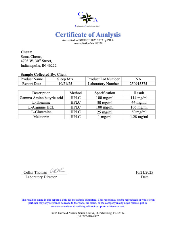 Sleep Mix is a targeted research formulation designed to support studies related to circadian regulation, neurotransmitter activity, and neuromodulation. Each 226 mg dose contains GABA (100 mg), L-Arginine (100 mg), Melatonin (1 mg), and L-Glutamine (25 mg). This combination is commonly explored in vitro for its influence on sleep-wake cycle pathways, nitric oxide synthesis, and neurotransmitter balance. GABA and Melatonin are frequently studied for their roles in modulating neuronal excitability and circadian rhythm signaling, while Arginine and Glutamine support metabolic and cellular repair functions.